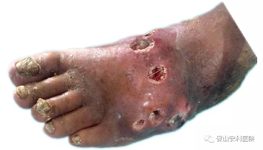 經(jīng)專科醫(yī)生檢查:左足背見(jiàn)腫塊,局部皮膚潮紅,有6個(gè)破潰口,流出豆腐渣樣物, 診斷為痛風(fēng)性關(guān)節(jié)炎急性發(fā)作并破潰感染,若不及時(shí)治療,傷口感染將會(huì)導(dǎo)致截肢。醫(yī)生首先應(yīng)用抗感染,止痛,降尿酸和傳統(tǒng)的換藥方法對(duì)創(chuàng)面清創(chuàng)、消毒、引流治療,入院第9天感染得到控制,但創(chuàng)面沒(méi)有愈合的跡象,應(yīng)用創(chuàng)面負(fù)壓聯(lián)合自體富血小板凝膠治療,創(chuàng)面愈合,恢復(fù)順利,治愈出院。