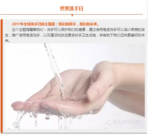 保山安利醫(yī)院感染管理科祝燕主任提示你:洗手是個(gè)人衛(wèi)生和公共健康的基礎(chǔ),保持手部清潔衛(wèi)生是降低腹瀉等腸道傳染病和肺炎等呼吸道傳染病患病風(fēng)險(xiǎn)最有效和最廉價(jià)的方法之一,因此養(yǎng)成洗手的良好衛(wèi)生習(xí)慣,形成正確洗手的健康行為,對(duì)于預(yù)防和控制疾病傳播,定期洗手是必要的,保持手部干凈、遠(yuǎn)離細(xì)菌你將擁有健康的生活。